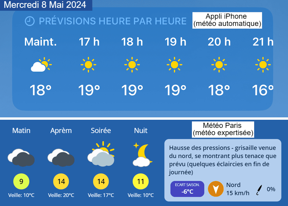 Comparaison des prévisions automatiques de l'appli sur iPhone et de nos prévisions expertisées sur Météo Paris