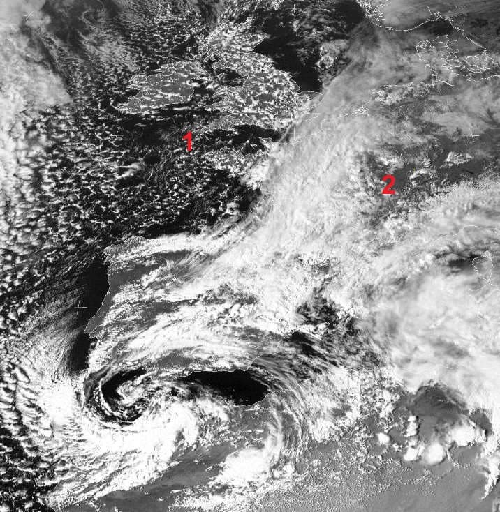 Sur l'image satellite prise mardi 24 mars à 16 h, outre le bel enroulement dépressionnaire vers le détroit de Gibraltar, on observait des cumulonimbus après le front froid (1), d'où des orages classiques de type hivernaux en Bretagne. D'autres nuages orageux étaient pointés à l'avant du front, entre Bourgogne et Franche Comté. Ces derniers ont provoqué les premiers orages de type estivaux favorisés par la hausse des températures à l'avant du front.