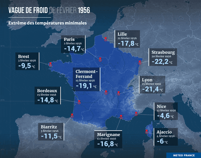 Pour autant, le climat actuel ne semble plus permettre les vagues de froid majeures d'antan. En février 1956 survenait la plus grosse vague de froid que la France n'ait jamais connue. La Seine avait gelé à Paris, le thermomètre avait plongé à -21,4°C à Lyon et -22,2°C à Strasbourg tandis que la ville de Saint-Tropez était paralysée sous des congères de plus d’un mètre de neige ! Avec des masses d'air polaire de moins en moins froides du fait du réchauffement climatique, revivre un froid d'une telle intensité semble plus qu'improbable...