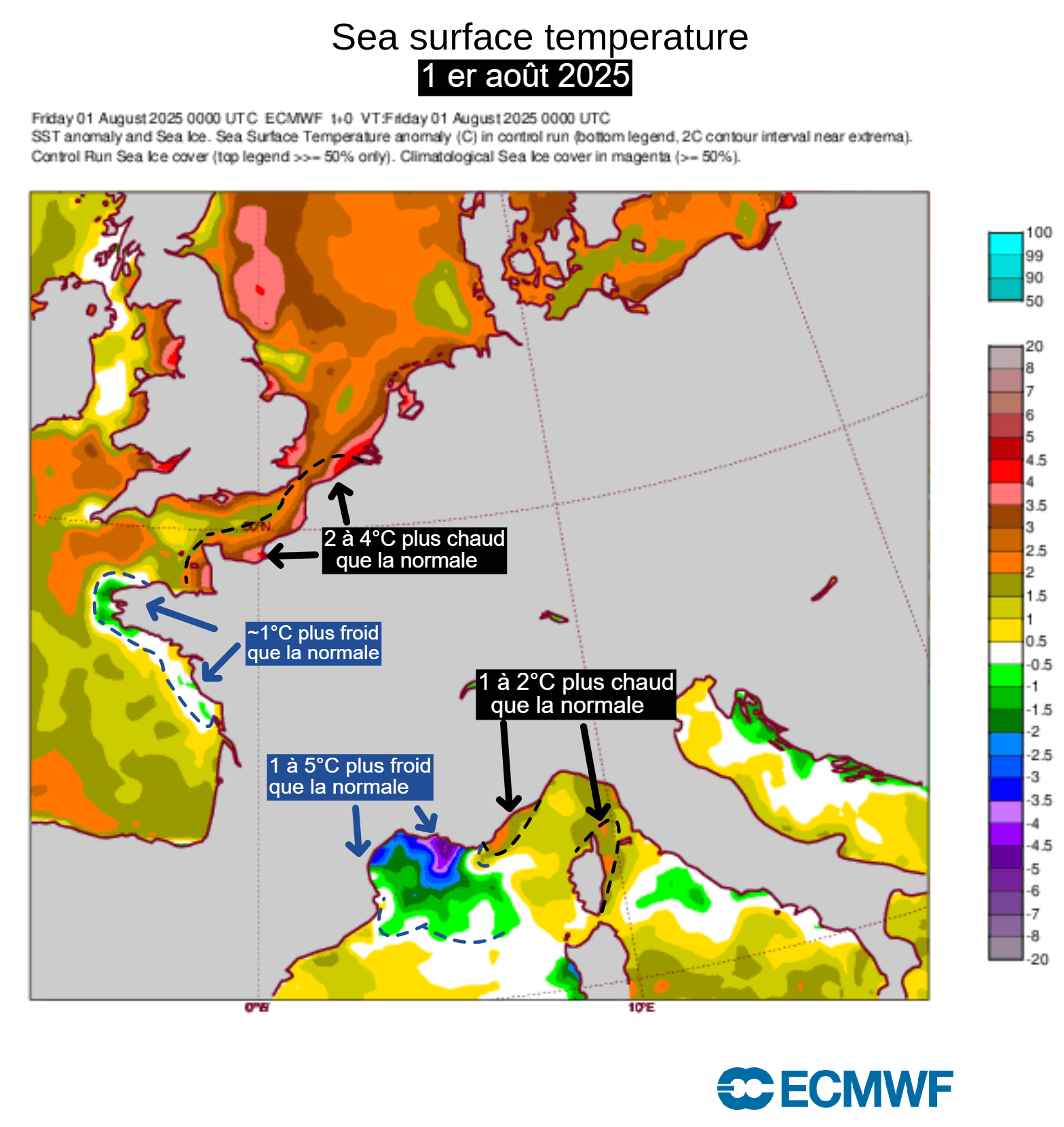 Anomalies de températures de la surface de l'eau sur la France au 1er août 2025 – ECMWF