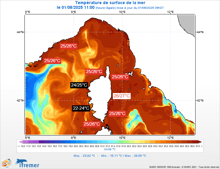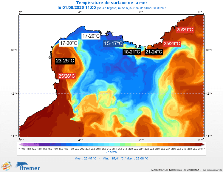 Températures de la surface de l'eau sur la côte méditerranéenne ce 1er août 2025 – IFREMER