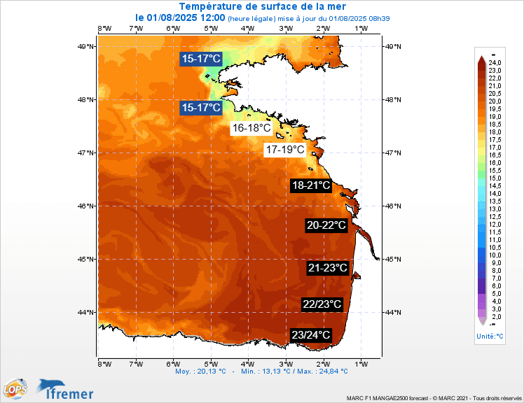 Températures de la surface de l'eau sur la côte Atlantique ce 1er août 2025 – IFREMER