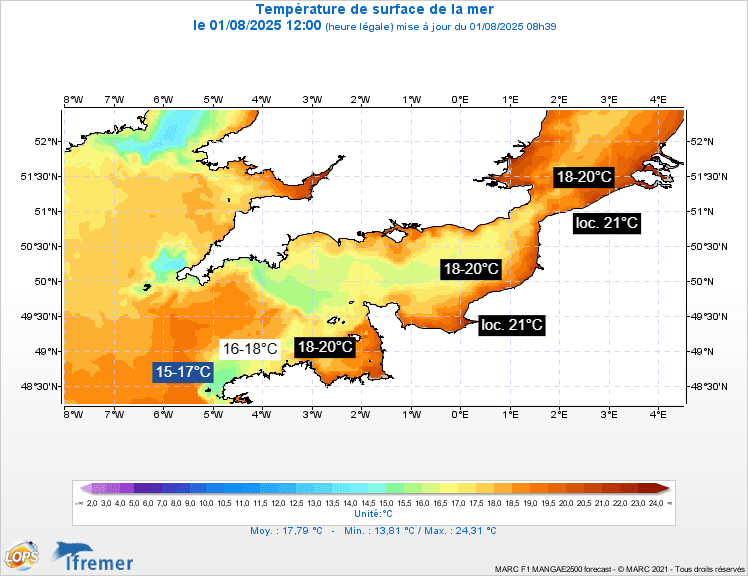 Températures de la surface de l'eau sur les littoraux de la Manche et de la mer du Nord ce 1er août 2025 - IFREMER