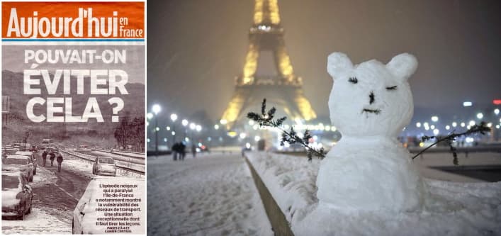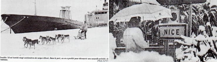 Cette vague de froid est aussi marquées par plusieurs épisodes neigeux. Les plus conséquents touchent la Normandie et la Bretagne. On circule à traineau dans le port de Brest sur une vingtaine de centimètres de neige ! Les flocons blanchissent également la côte d'Azur, notamment la ville de Nice.