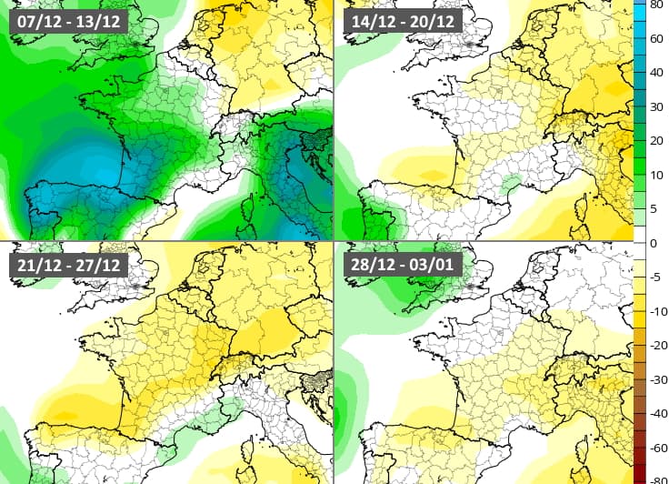 Concernant les précipitations, le scénario du modèle européen montre des cumuls importants cette semaine, en particulier sur le sud-ouest du pays. Les conditions redeviendraient plus classiques la semaine prochaine malgré des signaux humides plus net vers la Bretagne et le sud-est. En revanche, la semaine de Noël (du 21 au 27 décembre) pourrait être plus sèche (vers la Méditerranée). Il n'y a pas de tendance franche pour le passage à la nouvelle année.
