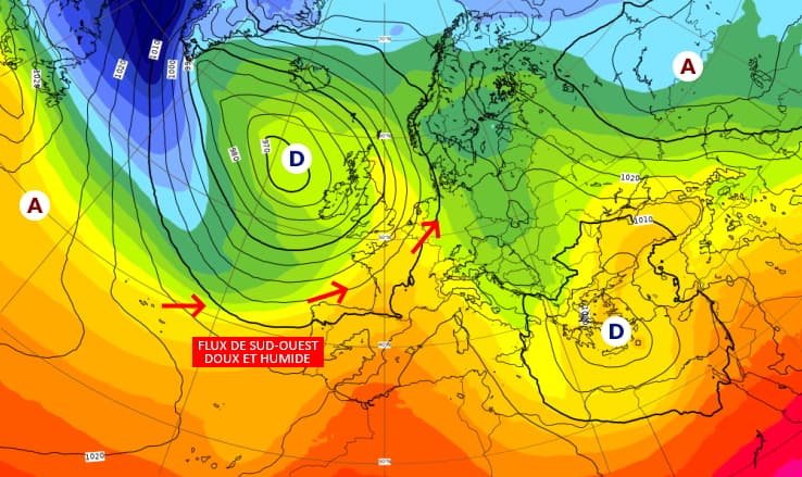 Un changement de régime se profile pour les prochains jours. En effet, la dépression méditerranéenne va progressivement s'éloigner vers les Balkans d'ici la fin de semaine tandis qu'un vaste système dépressionnaire prendra le relais sur le nord de l'Atlantique. C'est ce dernier qui va nous influencer en dirigeant un flux d'ouest à sud-ouest sensiblement plus doux.