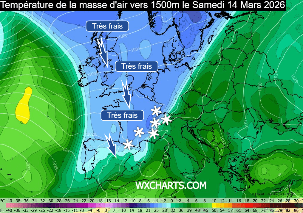 Après deux mois d'anomalie douce (un record en France), notre pays s'apprête à renouer avec des sensations nettement plus fraîches. Sous l'impulsion d'un talweg, une perturbation arrivera par le nord-ouest vendredi 13 mars 2026 et s'accompagnera d'un air sensiblement plus frais en provenance du nord de l'Atlantique. Ce front s'enfoncera vers les Pyrénées et les frontières de l'est samedi 14 mars, permettant à l'air frais de se généraliser. La température de la masse d'air vers 1500 mètres affichera alors -2 à -4°C, des niveaux inédits depuis de longues semaines au dessus de la France !