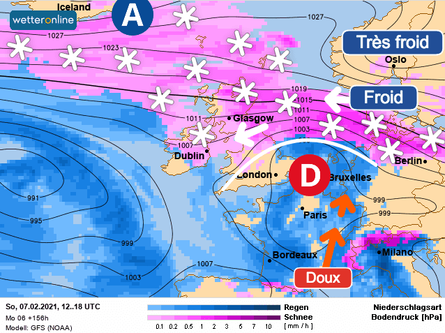 Cette dépression induira un fort conflit de masse d’air sur le pays avec la mise en place d’un flux continental entre les îles britanniques, le Nord de la France et l’Allemagne amenant de nouveau l’air froid scandinave jusqu’à nos portes. A l’avant du centre dépressionnaire le flux resterait orienté au Sud-Ouest avec un air doux persistant possiblement plus longtemps.