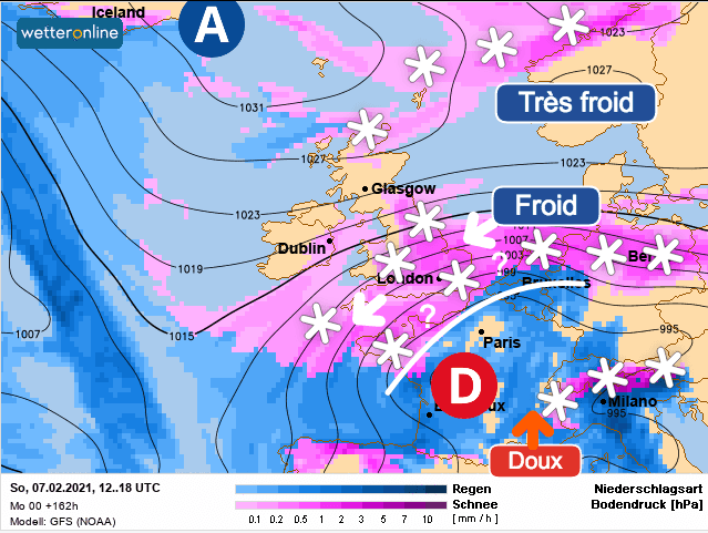 Schéma de la situation sur l’Ouest de l’Europe (scénario du modèle CEP) pour dimanche 7 février – via météociel.fr