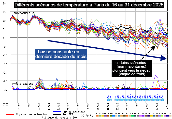 Différents scénarios de température à Paris du 16 au 31 décembre 2025 - meteociel.fr