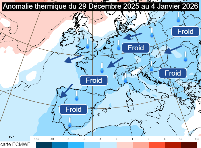 S'il n'est pour l'instant pas question d'une vague de froid - car les réserves en froid sont bien maigres sur le nord-est du continent - il est possible que ce refroidissement s'inscrive dans la durée. D'ailleurs, les modélisations d'anomalie thermique pour la semaine du lundi 29 décembre 2025 au dimanche 4 janvier 2026 virent au bleu sur une grande partie de l'Europe. Avec un anticyclone vissé sur le nord du continent, le flux d'est à nord-est pourrait se maintenir et permettre au froid de s'affirmer au fil des jours. Il est possible que la fin 2025 devienne véritablement hivernale.
