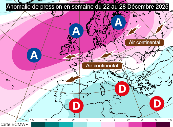 Un changement radical de configuration semble se confirmer. Ce dernier interviendra surtout dès le début de la semaine prochaine, marquée par les fêtes de Noël. En effet, un puissant anticyclone devrait se mettre en place sur le nord de l'Europe, des Açores jusqu'à la Scandinavie. Dans le même temps, les basses pressions concerneront le bassin méditerranéen. Avec la mise en place de cette configuration, le flux va progressivement se continentaliser avec un vent finissant par s'orienter au nord-est, conduisant à une baisse des températures.