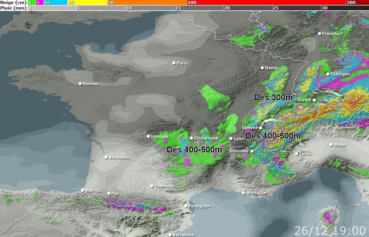 Ce scénario semble prendre un peu d’embonpoint dans les dernières modélisations avec une situation possiblement très dépressionnaire et froide envisagée après le 27/28 décembre. Un large système dépressionnaire pourrait en effet plonger sur le pays par le Nord/Nord-Ouest, apportant un froid plus humide et un risque d’épisode neigeux plus étendu jusqu’en plaine.