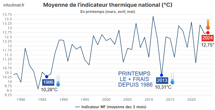 Température moyenne en France au cours du printemps de 1978 à 2024 - graphique infoclimat.fr
