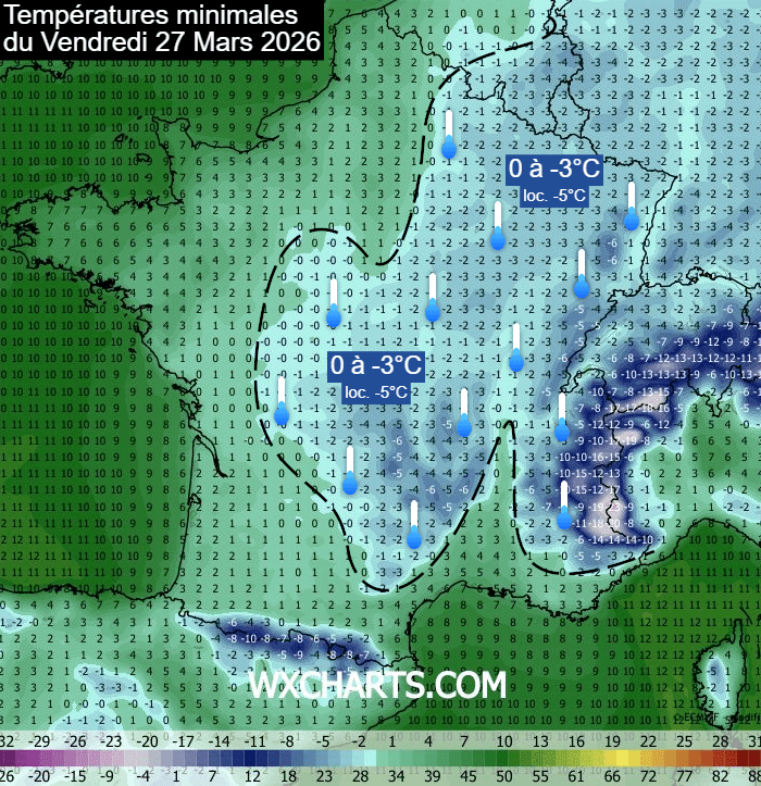 Températures minimales prévue le vendredi 27 mars 2026 - wxcharts.com