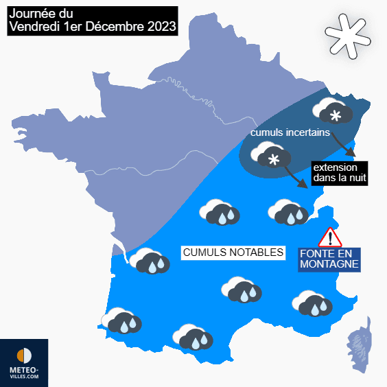 Une nouvelle onde pluvieuse devrait suivre le même chemin que la précédente en journée du vendredi 1er décembre 2023, arrosant les régions situées entre le sud-ouest et les frontières de l'est. Une fois encore, un risque de neige devrait apparaître au niveau de la zone de contact avec l'air froid, a priori entre le nord de la Bourgogne et l'Alsace. En soirée et nuit suivante, le risque de neige progresserait vers les plaines de Franche-Comté et jusqu'aux plus basses vallées du nord des Alpes, après une nouvelle journée copieusement arrosée. Là encore, il existe encore des divergences notables qui rendent la prévision plus que délicate (difficile de donner de possibles cumuls).