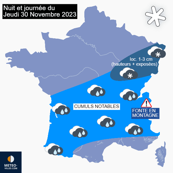 Risque de neige en nuit et journée du jeudi 30 novembre 2023 - Météo Villes