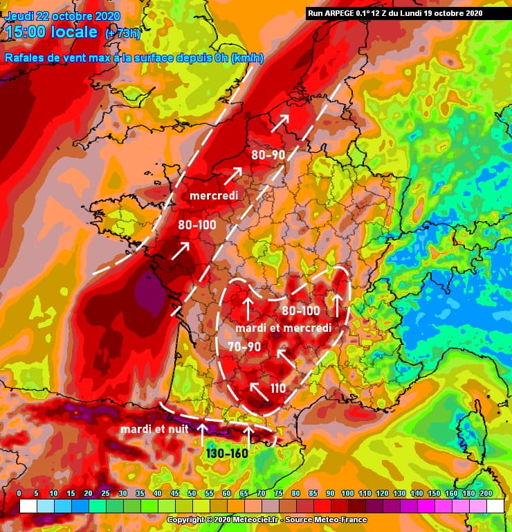 Carte des rafales maximales les mardi 20 et mercredi 21 octobre 2020 - modèle Arpège via meteociel.fr