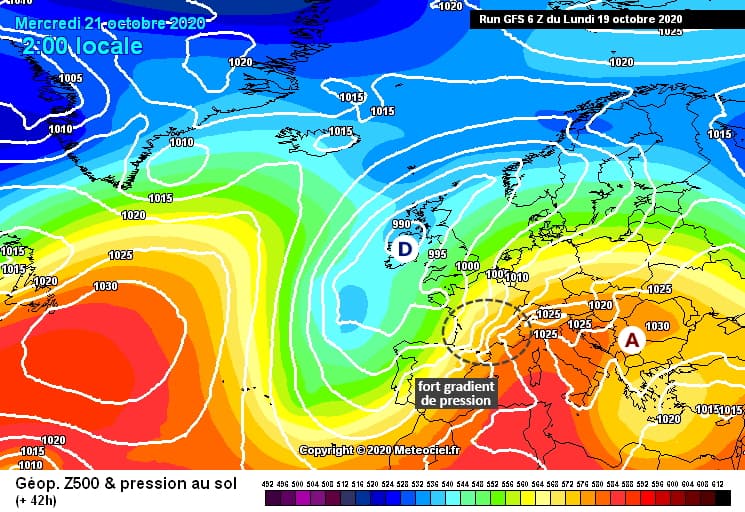 La France se retrouve balancée entre les hautes et les basses pressions et c'est sur le sud de notre pays que le gradient de pression est le plus important. En d'autres termes, la variation du baromètre est importante sur de courtes distances : autour de 995 hPa en Bretagne contre près de 1025 hPa sur les Alpes - soit 30 hPa en 1000 km !