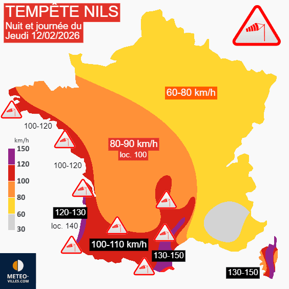 Ainsi, les rafales tempétueuses débuteront en nuit du mercredi 11 au jeudi 12 février 2026 sur l'arc atlantique avec 100 à 120 km/h, parfois 130 km/h voire très ponctuellement 140 km/h sur le littoral aquitain ! Ces vents tempétueux vont s'enfoncer sur le sud-ouest avec des pointes de 100-110 km/h au sud de la Garonne jusqu'à jeudi matin. C'est dans le domaine de la tramontane et sur l'ouest des Cévennes que la tempête sera la plus violente avec des rafales de 120 à 140 km/h voire 150-160 km/h sur les sommets jusqu'à jeudi après-midi ! Des rafales du même d'ordre frapperont ensuite la montagne corse et les extrémités de l'île. Notons que dans toutes les régions de l'ouest et du centre de la France, des pointes de 80 à 90 km/h (voire localement 100 km/h) pourront être enregistrées.
