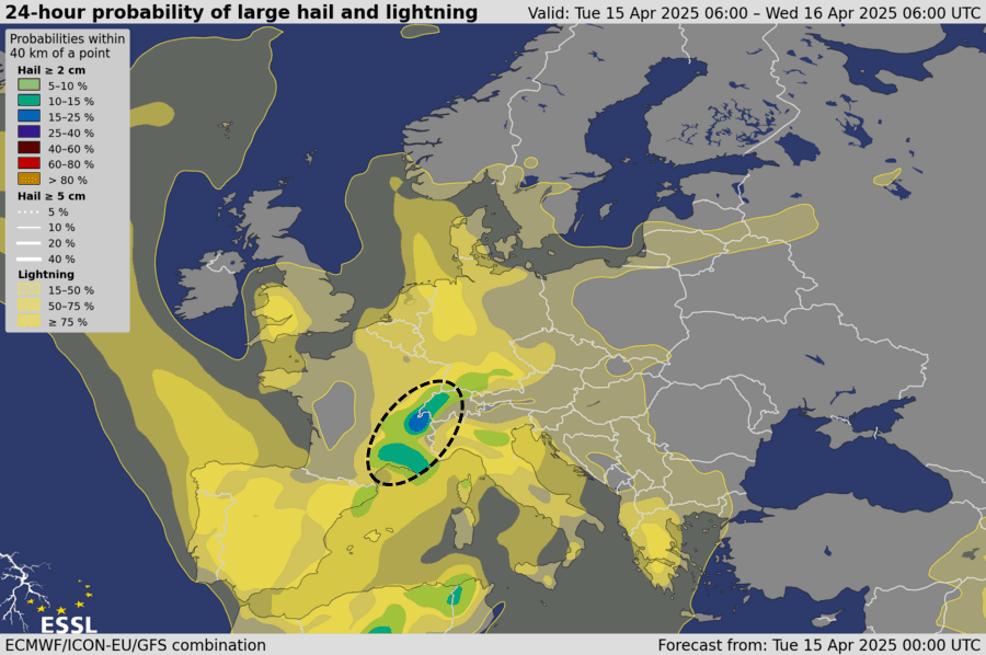 Carte du risque de grêle pour ce mardi 15 avril 2025 - ESSL