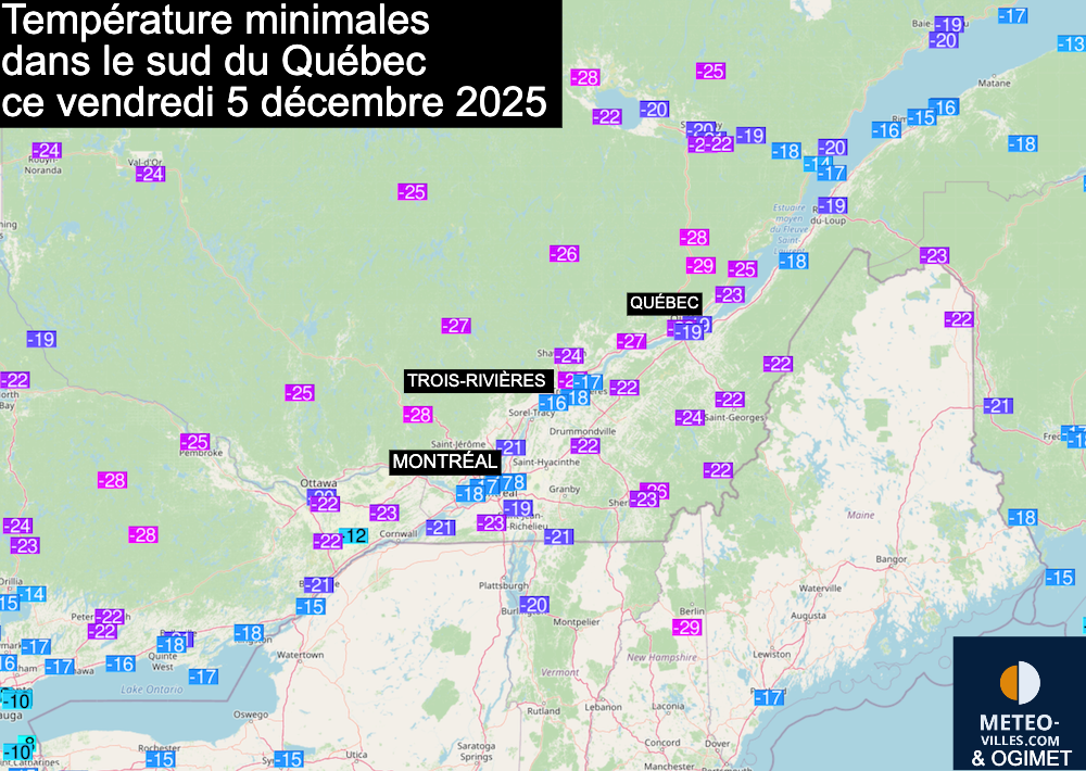Températures minimales relevées sur le Québec ce 5 décembre 2025 – Infoclimat.fr