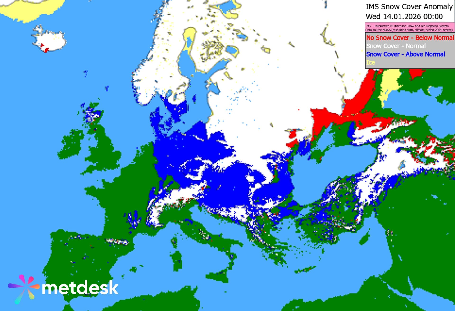 Anomalies de couche de neige au sol sur l'Europe le 14 janvier 2026 – MetDesk