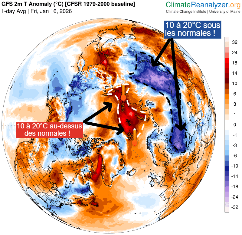 Anomalies de températures dans l'hémisphère nord ce 16 janvier 2026 – Climate Reanalyzer