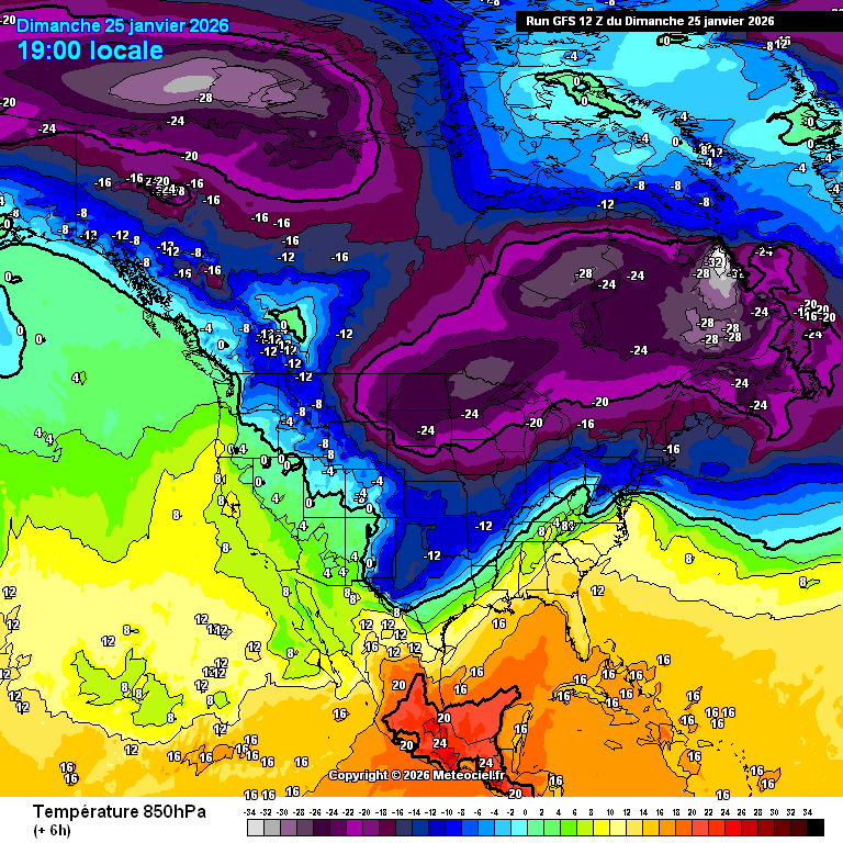 Évolution des températures à 850 hPa sur l'Amérique du Nord du 26 au 31 janvier 2026 – via meteociel