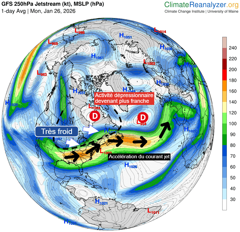 Celles-ci vont alors traverser l'océan en direction de l'Europe grâce à un courant jet également accéléré par cette arrivée massive d'air froid par l'Amérique du Nord. C'est alors un flux océanique plus ou moins actif qui va s'étendre jusqu'à notre pays dans les prochains jours.