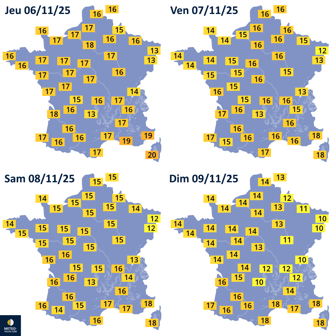Températures maximales prévues du jeudi 6 au dimanche 9 novembre 2025 - Météo Villes