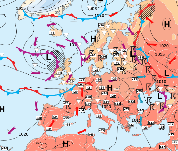 + La canicule qui concerne actuellement les régions du Sud-est est liée à l’air extrêmement chaud qui remonte d’Afrique du Nord et englobe notamment une bonne partie du pourtour méditerranéen (responsable des incendies catastrophiques qui touchent depuis quelques semaines la Grèce ainsi qu’une partie de l’Italie et du Maghreb).