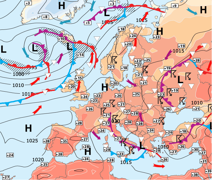 + Pour le moment, l’anticyclone des Açores qui étend son influence jusque sur la Scandinavie, nous évite les fortes chaleurs sahariennes qui s'arrêtent au niveau de l'Espagne.