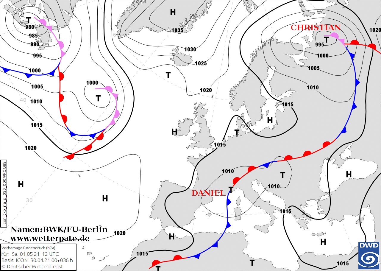 Noms des dépressions et anticyclones prévus pour samedi 1er mai 2021 à midi (Berlin)