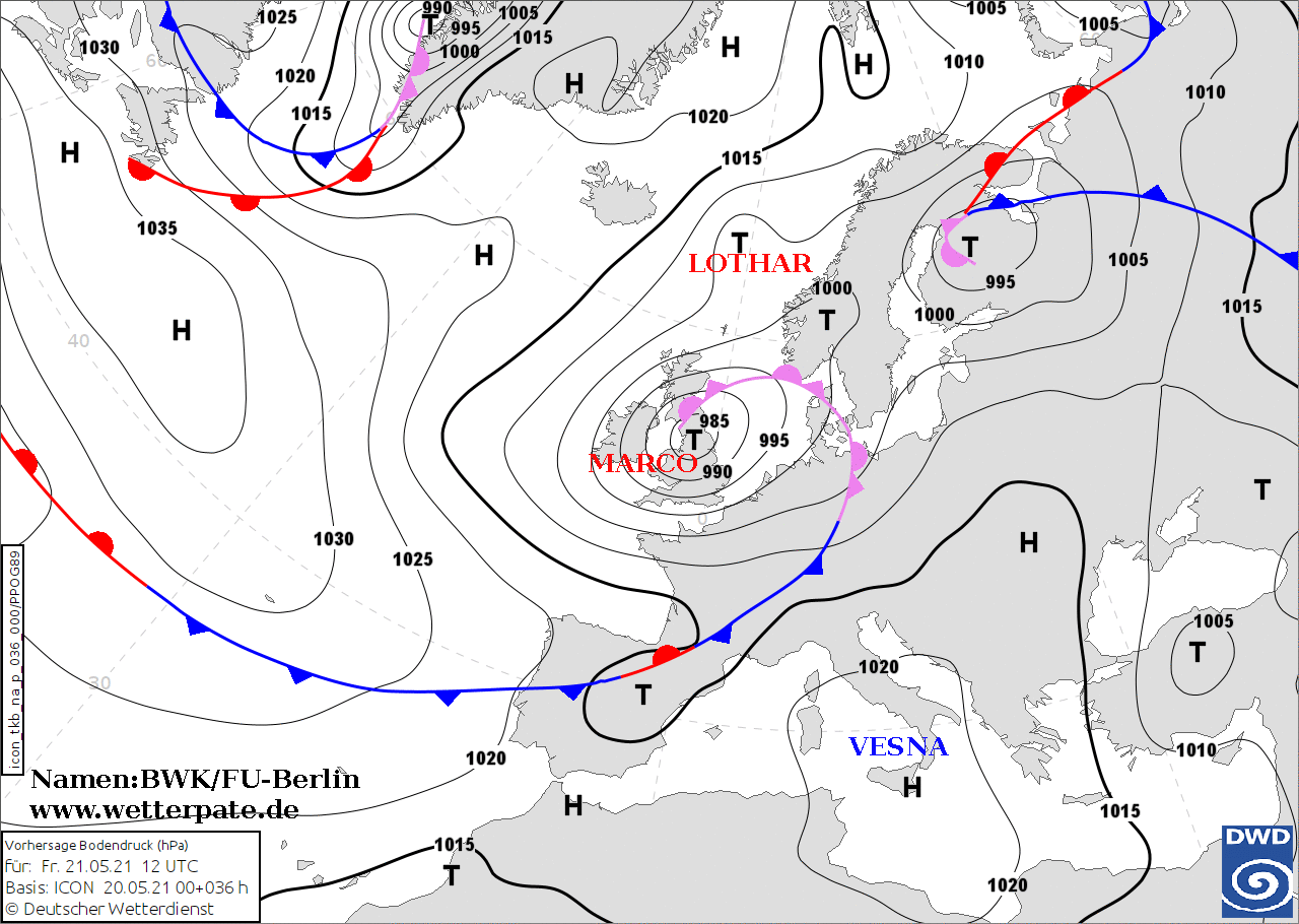 Noms des dépressions et anticyclones prévus pour vendredi 21 mai 2021 à midi (Berlin)