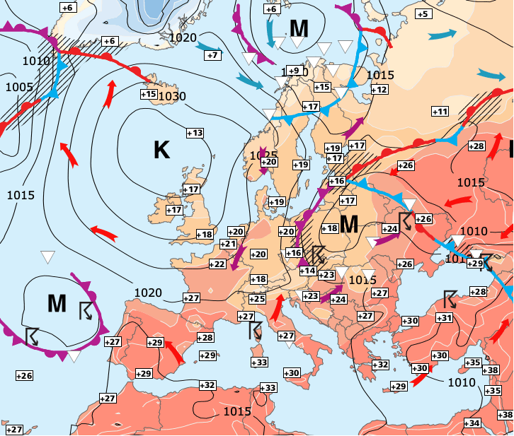 Noms des dépressions et anticyclones prévus pour mercredi 1er septembre 2021 à midi (Berlin)