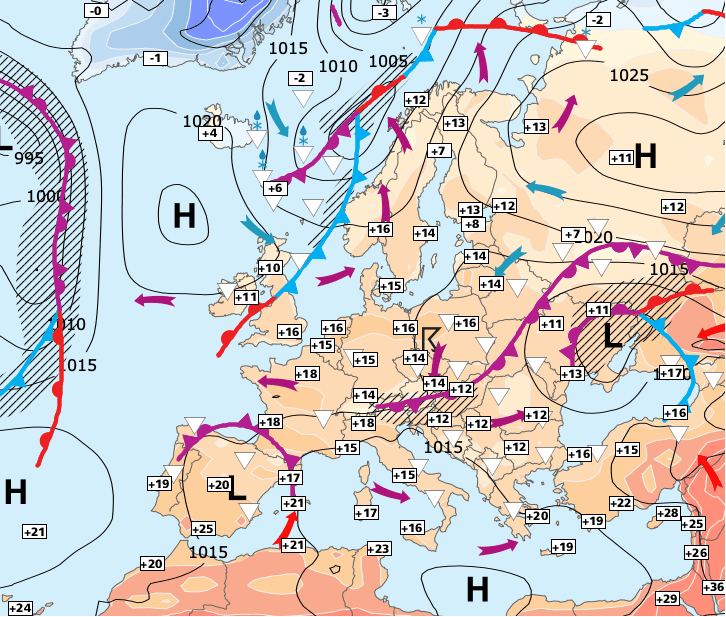 + C’est cette cellule de hautes pressions qui nous vaudra une fin de semaine plutôt ensoleillée et presque estivale sur un grand quart Sud-ouest.