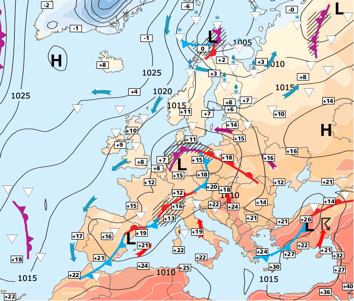 + Nous sommes désormais situés entre l’air chaud qui remonte en Méditerranée et l’air froid qui descend de Scandinavie.