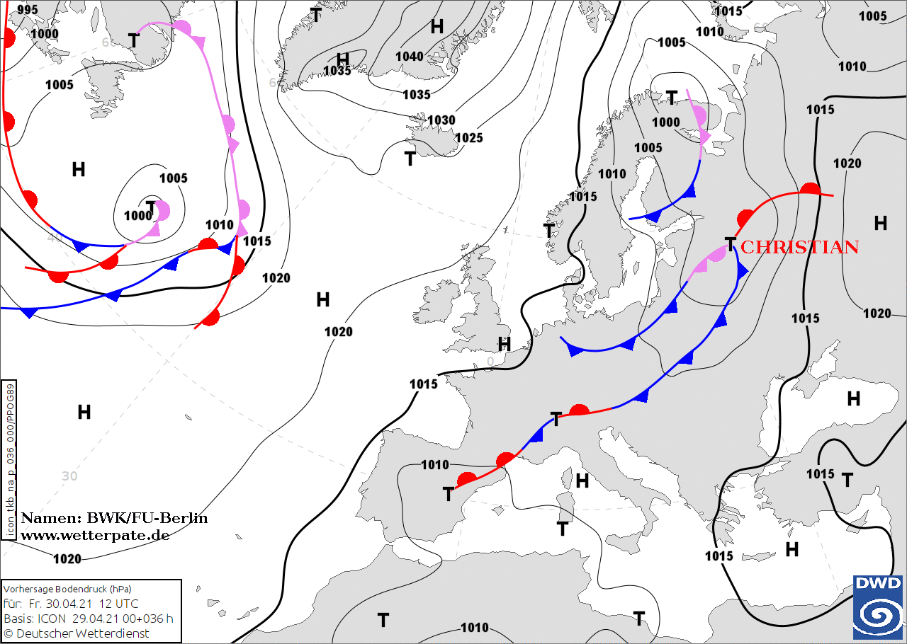 Noms des dépressions et anticyclones prévus pour vendredi 30 avril 2021 à midi (Berlin)