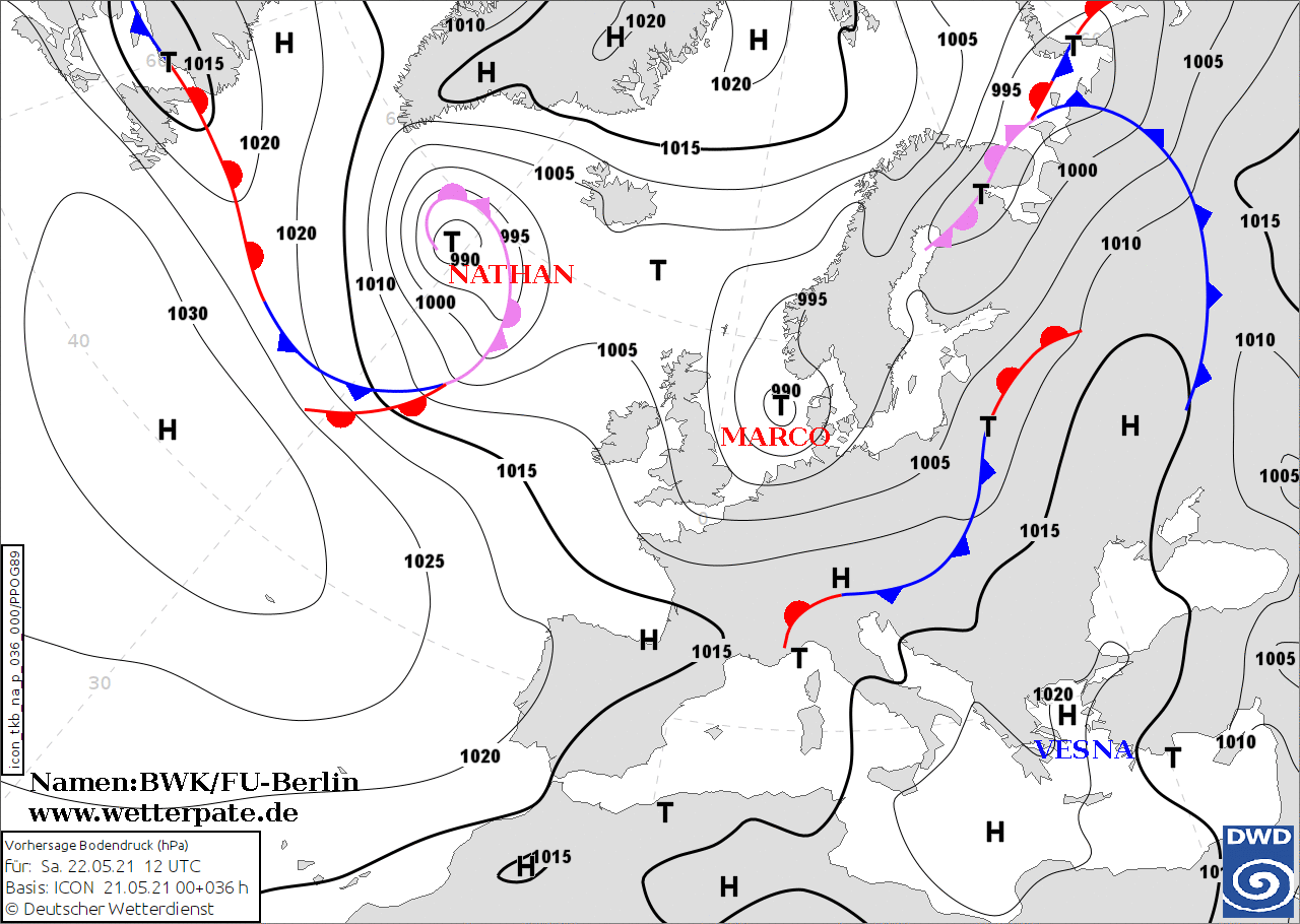 Noms des dépressions et anticyclones prévus pour samedi 22 mai 2021 à midi (Berlin)