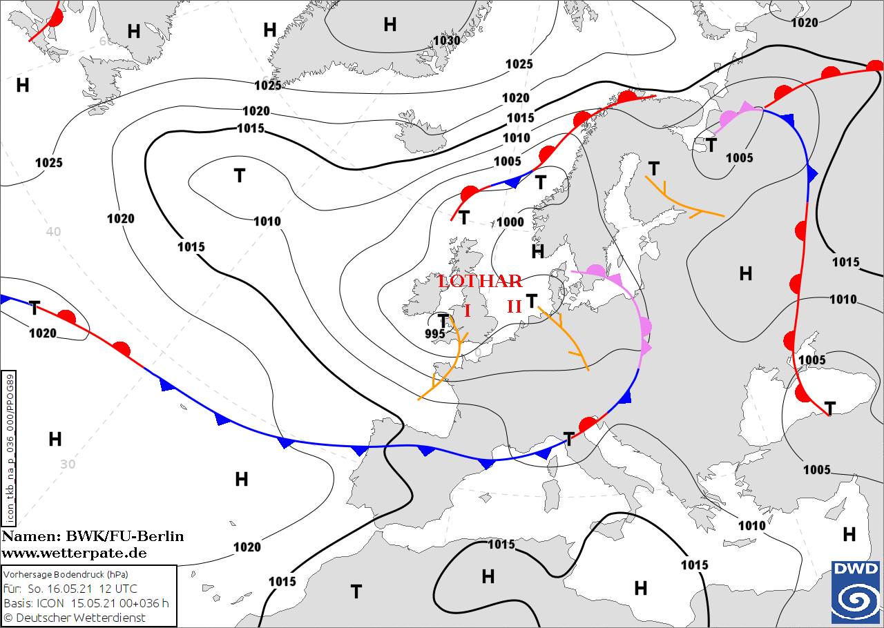 Noms des dépressions et anticyclones prévus pour dimanche 16 mai 2021 à midi (Berlin)