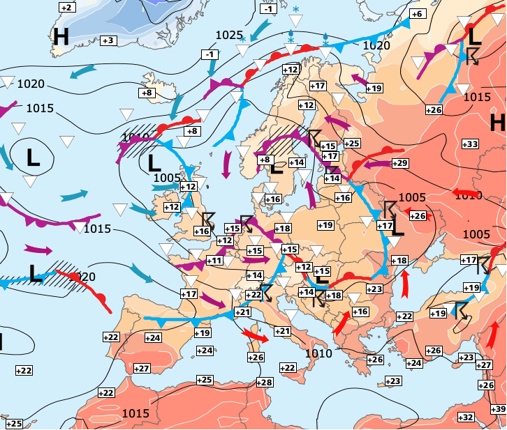 + Mais cette accalmie ne sera que de courte durée car une nouvelle zone dépressionnaire(se déplaçant des îles britanniques à la Scandinavie) engendrera un temps très perturbé durant le week-end de la Pentecôte.