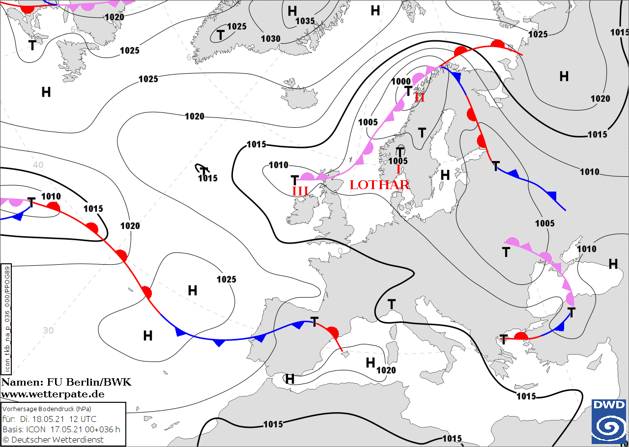 Noms des dépressions et anticyclones prévus pour mardi 18 mai 2021 à midi (Berlin)