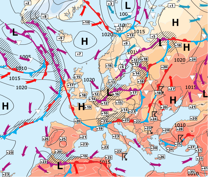 Noms des dépressions et anticyclones prévus pour vendredi 28 mai 2021 à midi (Berlin)