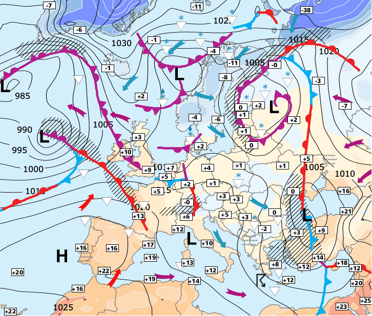 + Le froid qui englobe toute l’Europe du Nord est aux portes de la France... Mais dans un avenir proche, c’est l’air doux qui va dominer (et même s'accentuer).