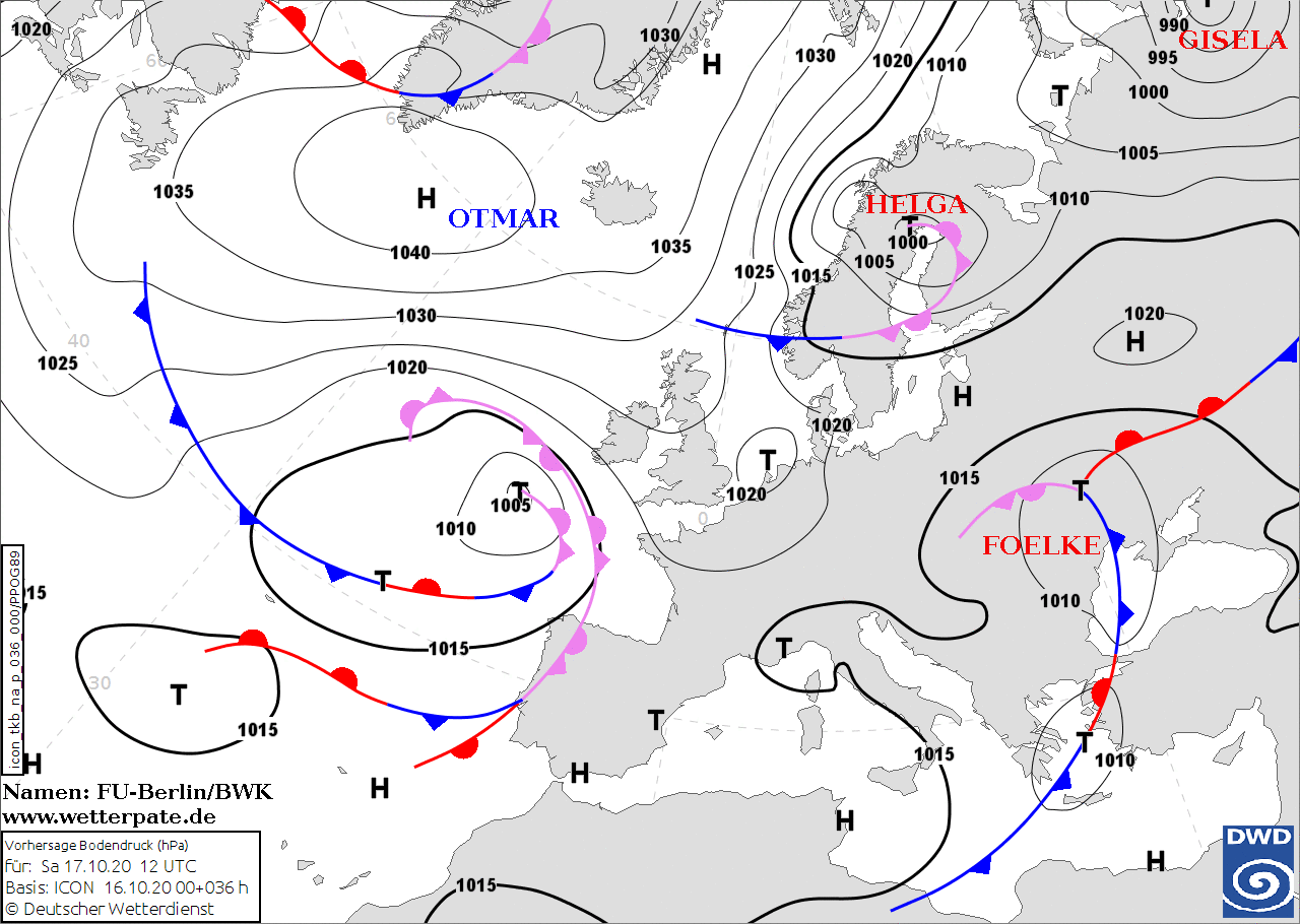 Noms des dépressions et anticyclones prévus pour samedi 17 octobre 2020 à midi (Berlin)