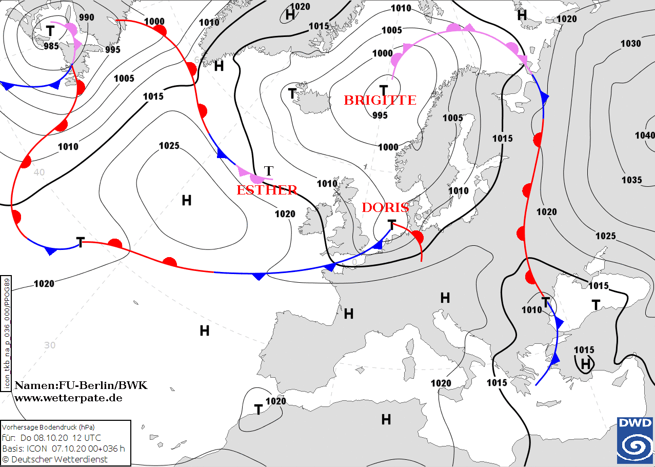 Noms des dépressions et anticyclones prévus pour jeudi 8 octobre 2020 à midi (Berlin)
