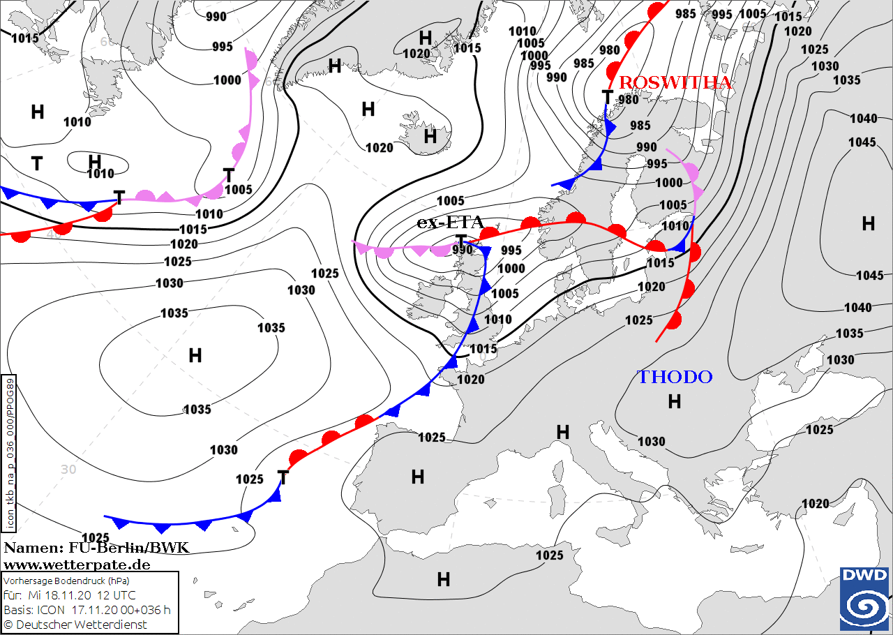 Noms des dépressions et anticyclones prévus pour mercredi 18 novembre 2020 à midi (Berlin)
