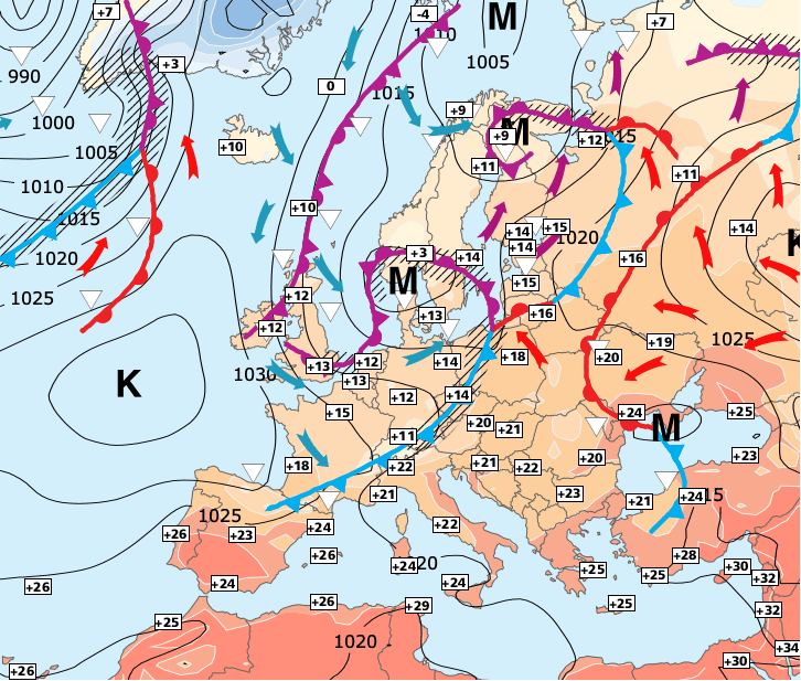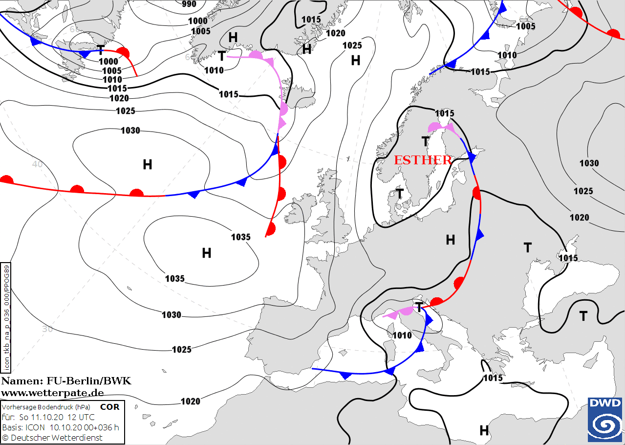 Noms des dépressions et anticyclones prévus pour dimanche 11 octobre 2020 à midi (Berlin)
