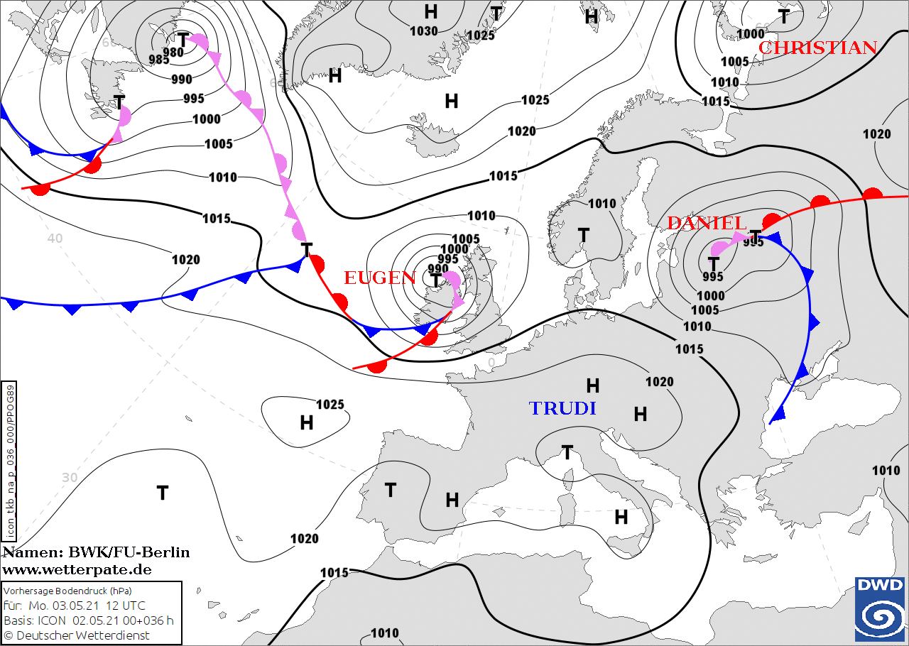 Noms des dépressions et anticyclones prévus pour mardi 4 mai 2021 à midi (Berlin)